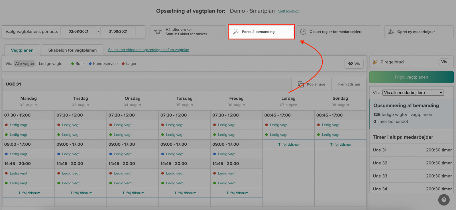 Når du er i planlægningsværktøjet, og du har tilføjet ledige vagter til din vagtplan, så klikker du blot på ‘Foreslå bemanding’, og så vil Assistenten gå i gang med at bemande dine vagter: