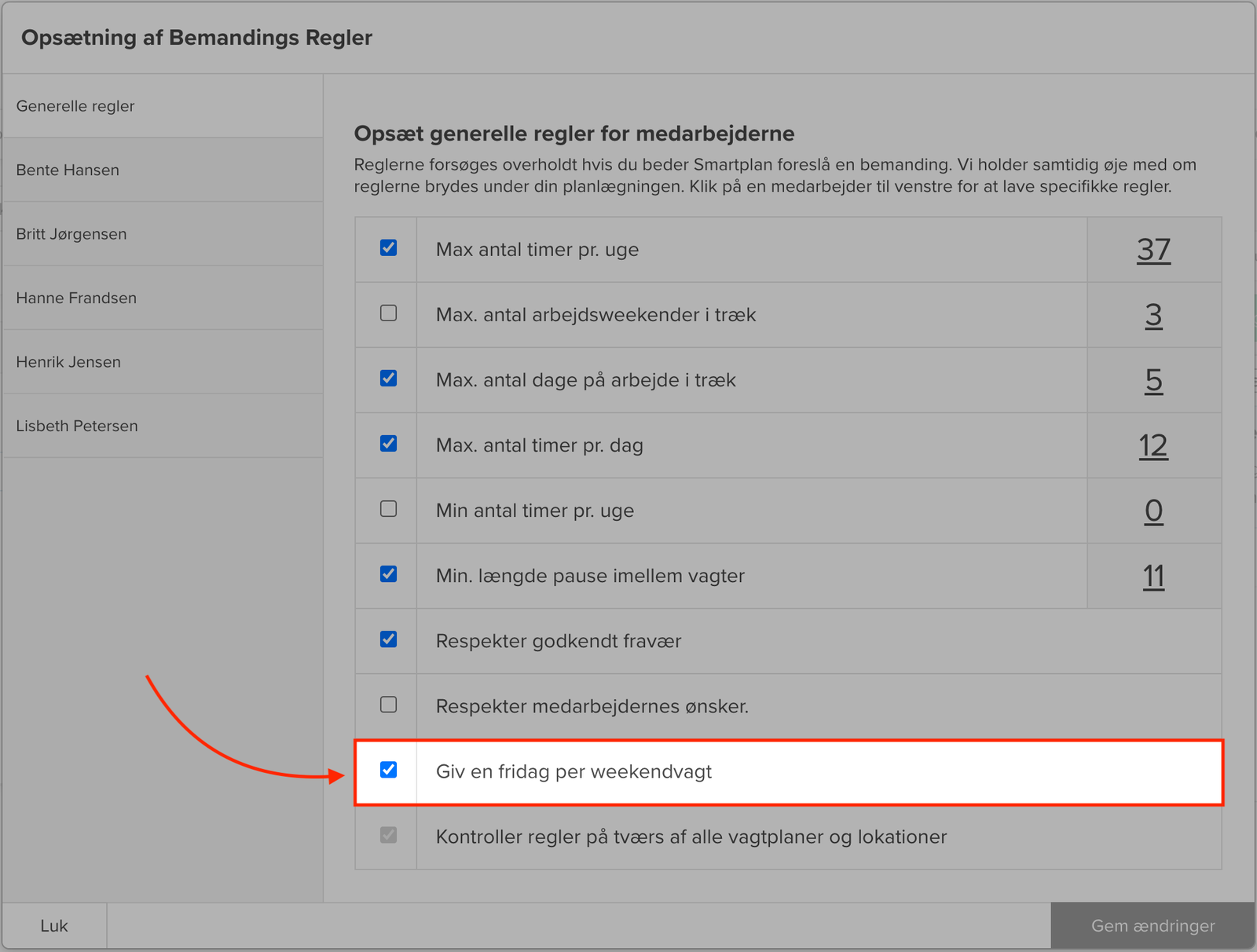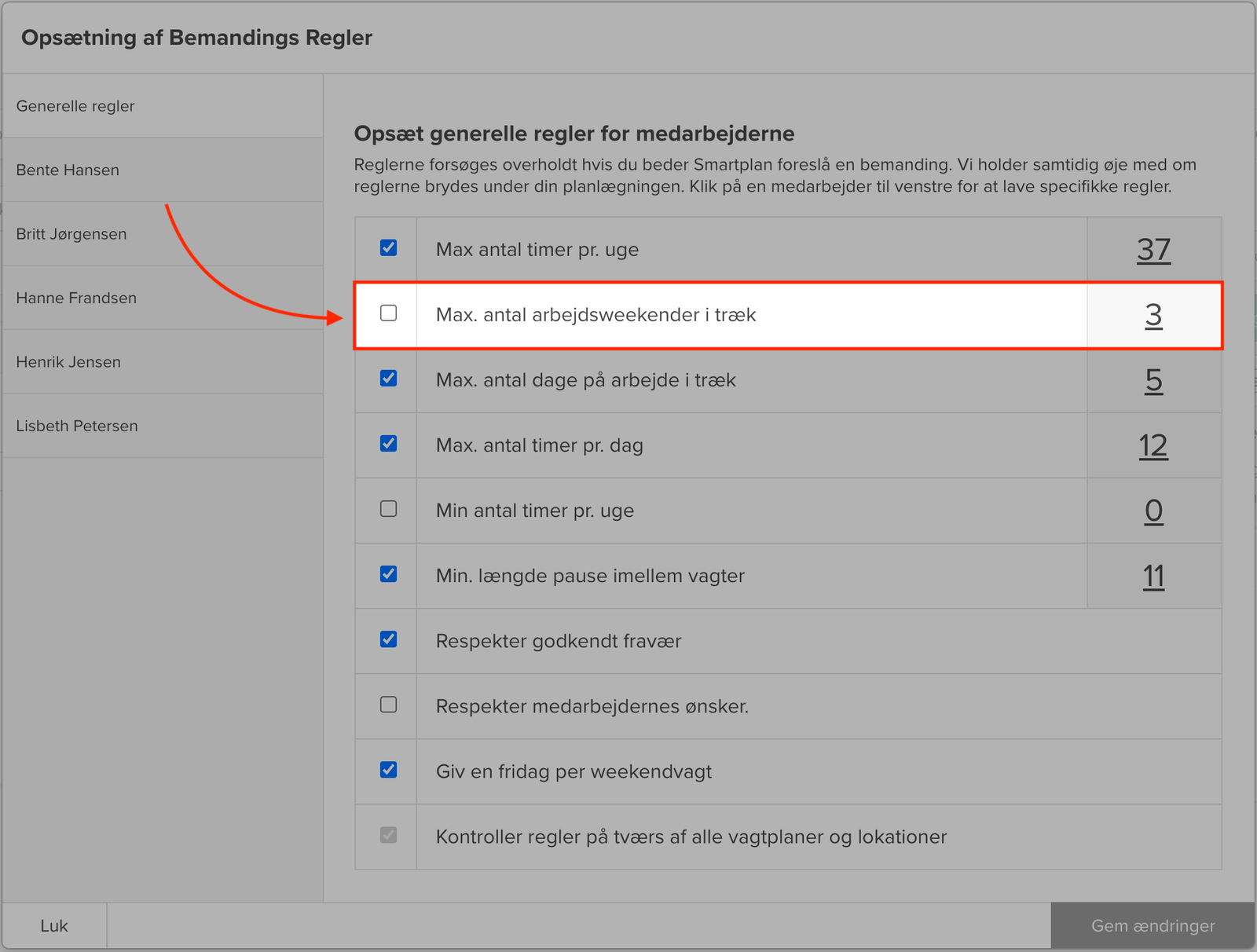 Førhen har det været et puslespil, som du manuelt skulle få til at gå op for hver enkelt medarbejder. Ikke længere. I stedet slår du blot vores nye regel til, og så vil systemet sørge for, at antallet af weekendvagter i træk bliver overholdt. Reglen finder du som normalt under ‘Opsæt regler for medarbejdere’ i planlægningsværktøjet: