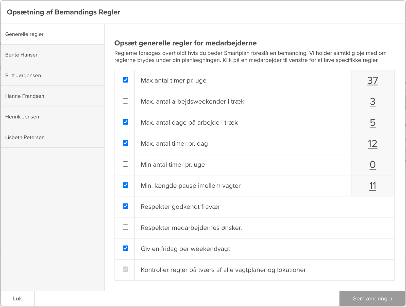 Du bestemmer hvor tilfældigt og hvordan vagterne bliver fordelt. I planlægningsværktøjet har du mulighed for at opsætte regler for dine medarbejdere, som systemet vil sørge for at overholde. Skal dine medarbejderes vagter overholde 11-timers reglen? Skal de højest arbejde 37 timer pr. uge eller mindre? Må medarbejderne max arbejde tre weekender i træk? Eller skal de have en dag fri efter weekendarbejde? Det - og meget mere - kan Smartplan Assistent hjælpe dig med at overholde, når din vagtplan skal bemandes.