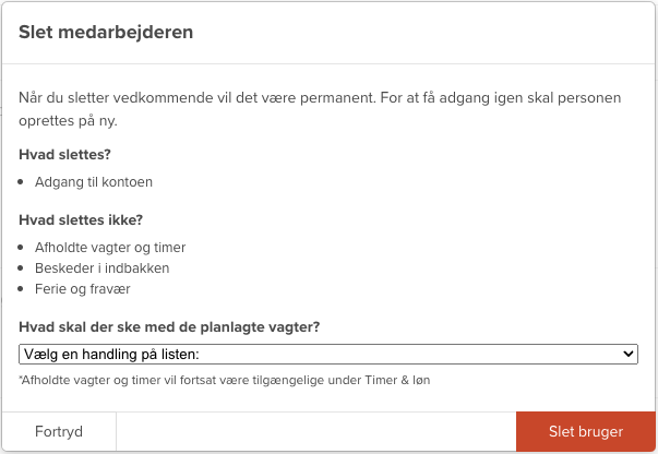 Når en medarbejder slettes, slettes vedkommendes adgang til jeres konto. Men du vil stadig kunne se medarbejderens afholdte timer og vagter samt beskeder i indbakken. Derudover skal du tage stilling til, hvad der skal ske med eventuelle kommende vagter.