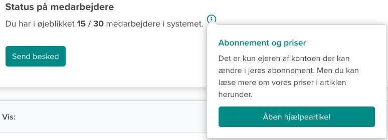 Derfor har vi nu tilføjet et lille ikon inde på medarbejdersiden med et link til vores priser. Det vil sige, at både kontoejer og administratorer fremover kan se, hvad det eventuelt vil koste, hvis I har behov for flere medarbejdere på kontoen: