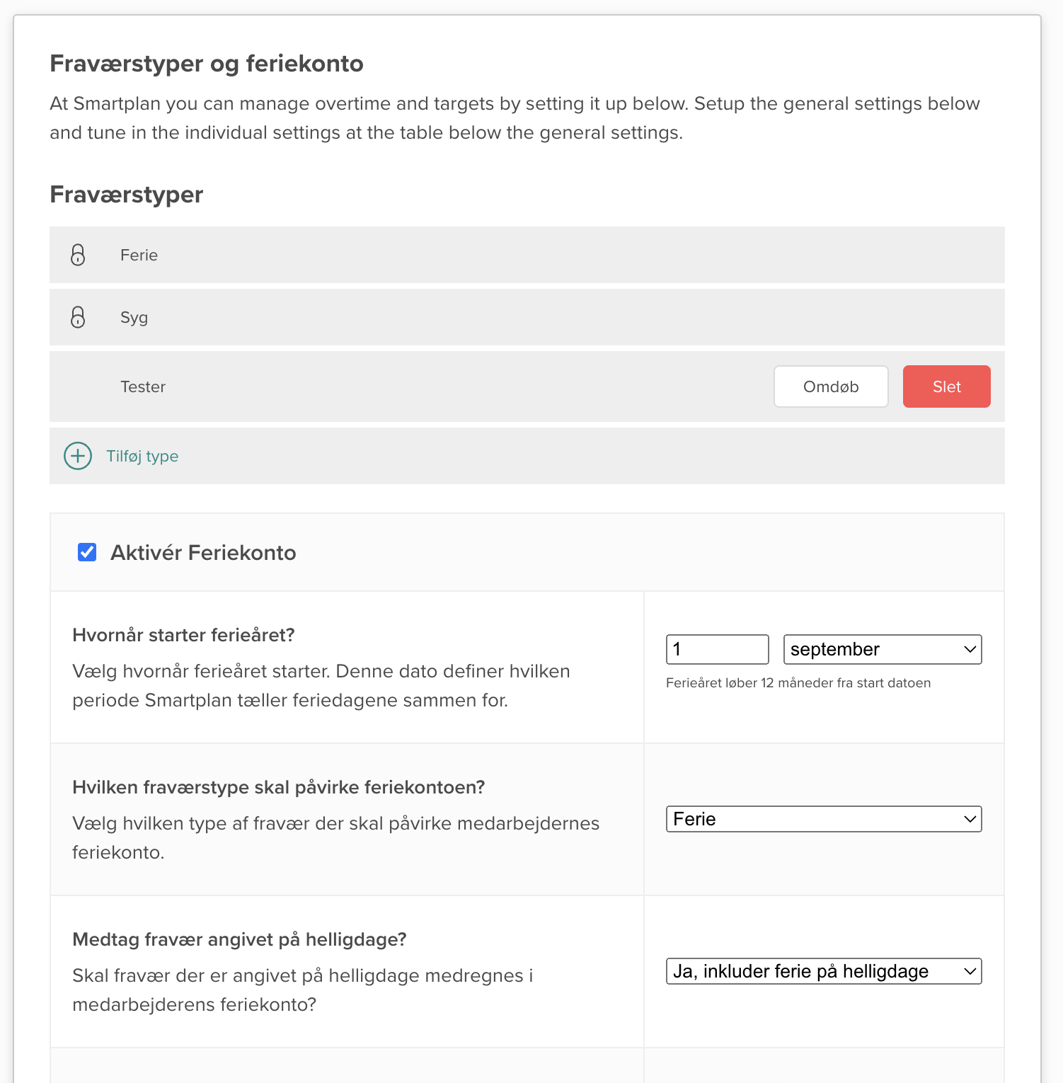 Inde i dine kontoindstillinger vil du have mulighed for at slå feriekontoen til - dette er selvfølgelig helt valgfrit. Hvis du slår den til, kan du vælge, hvilken type fravær der skal påvirke feriekontoen. Dette er altid over en årlig periode.