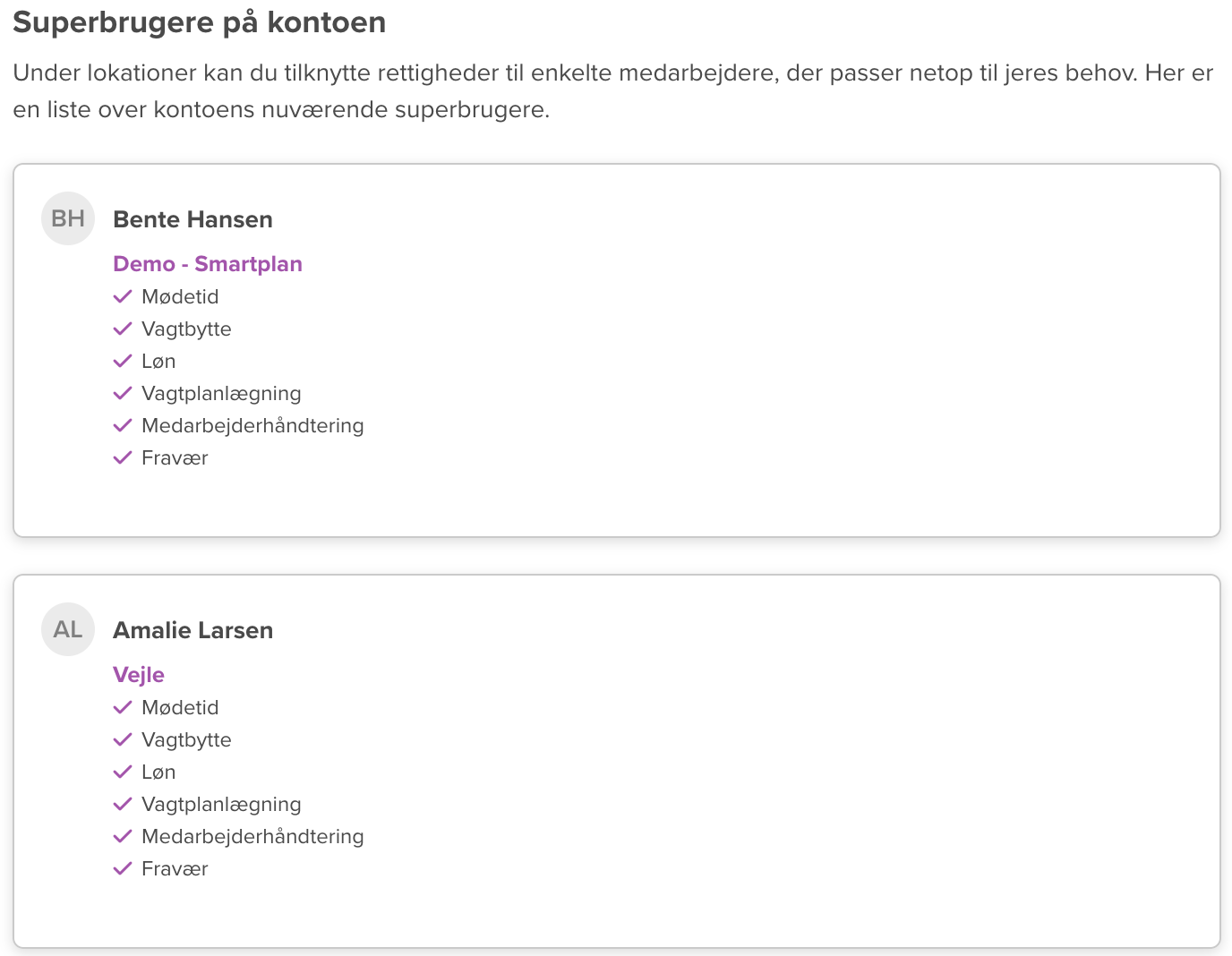 Måske har du en medarbejder, som er ansvarlig for at lave vagtplaner for alle jeres forskellige lokationer i Smartplan. I så fald gør du blot vedkommende til superbruger på alle jeres lokationer og vælger, at han eller hun skal have rettigheder til at håndtere vagtplaner på alle lokationerne.