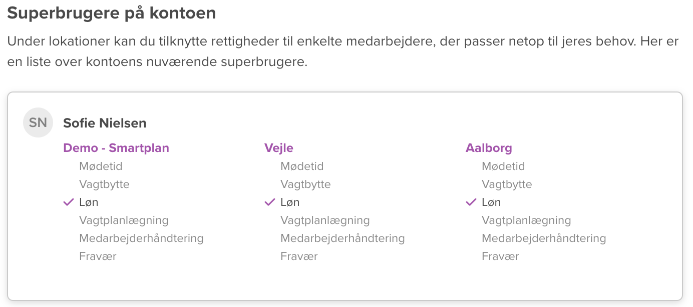 Det kan også være, at jeres bogholder har en bruger på jeres konto. Han eller hun skal kunne køre løn for hele virksomheden, men det er også det eneste, som vedkommende skal kunne håndtere i Smartplan. I så fald giver du igen personen superbrugerrettigheder på alle lokationerne, og så nøjes du med at give vedkommende rettigheder til at kunne køre løn.