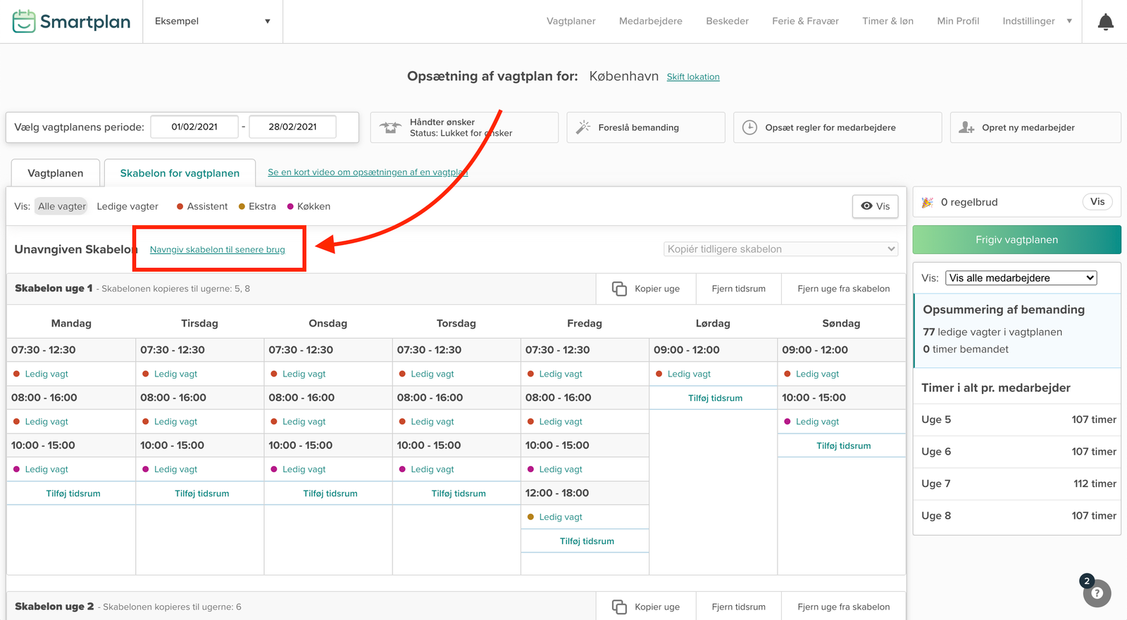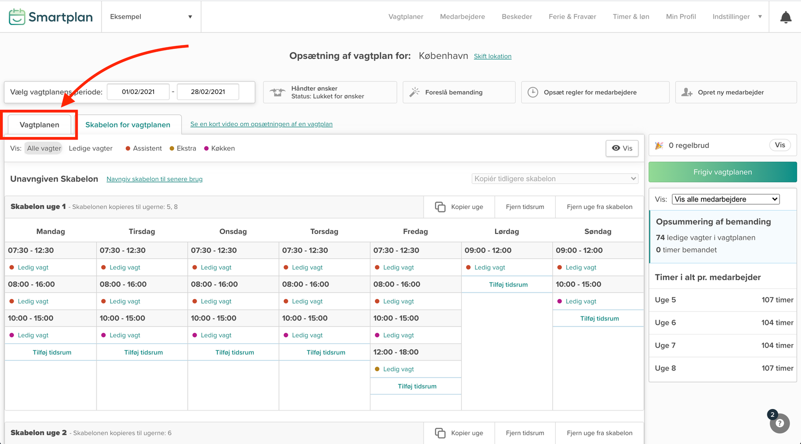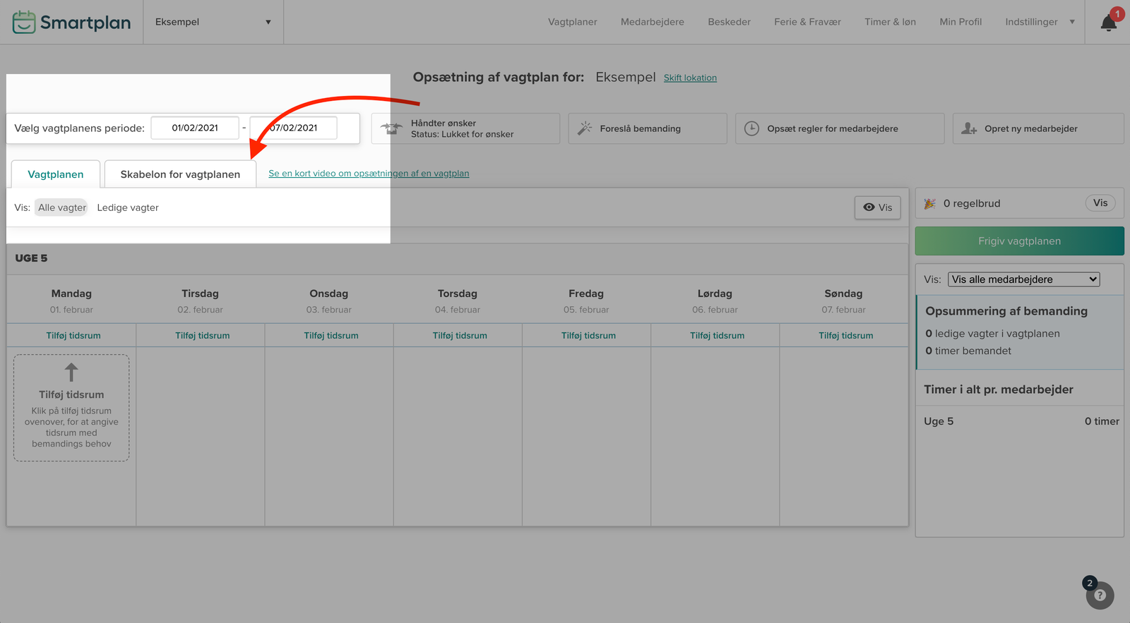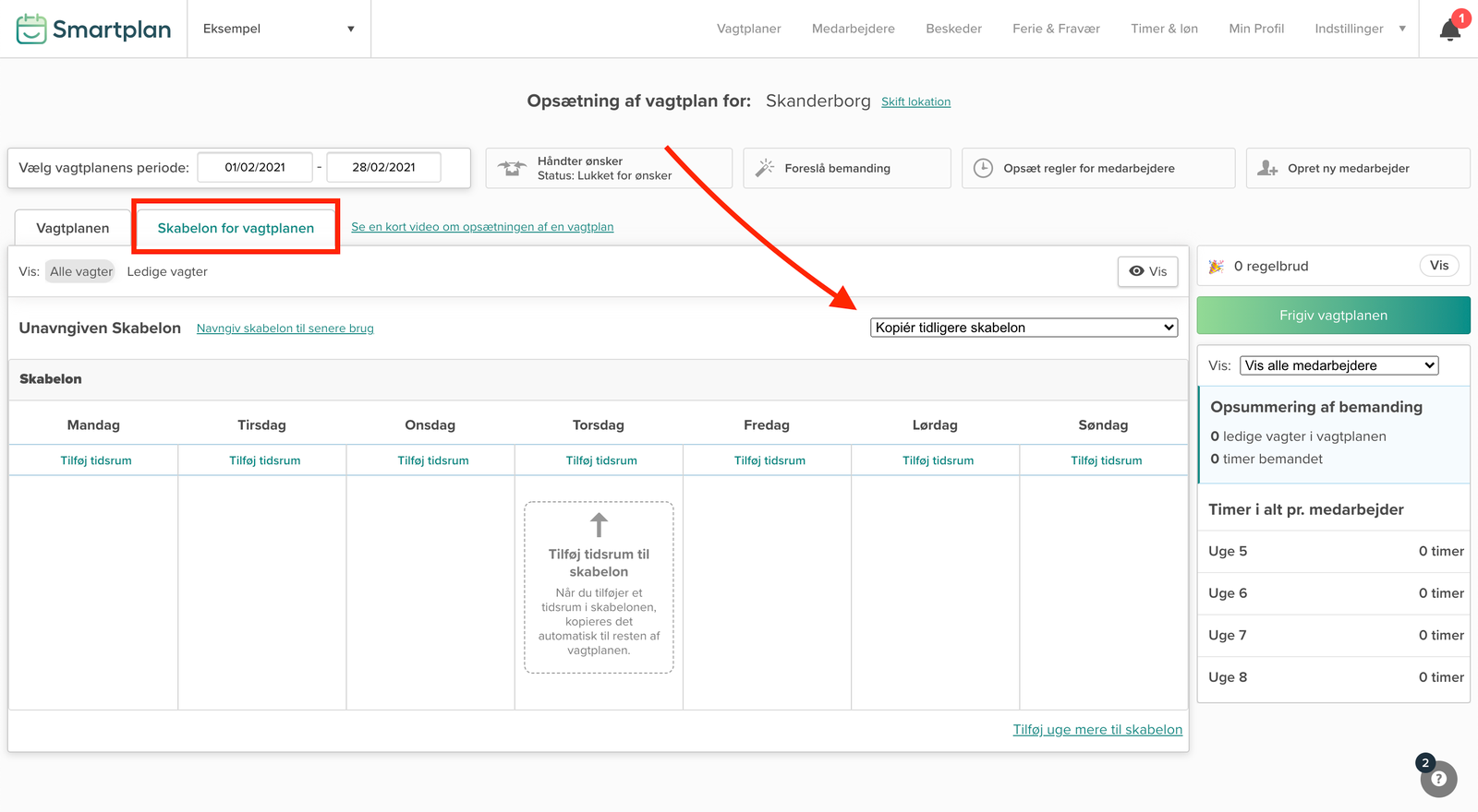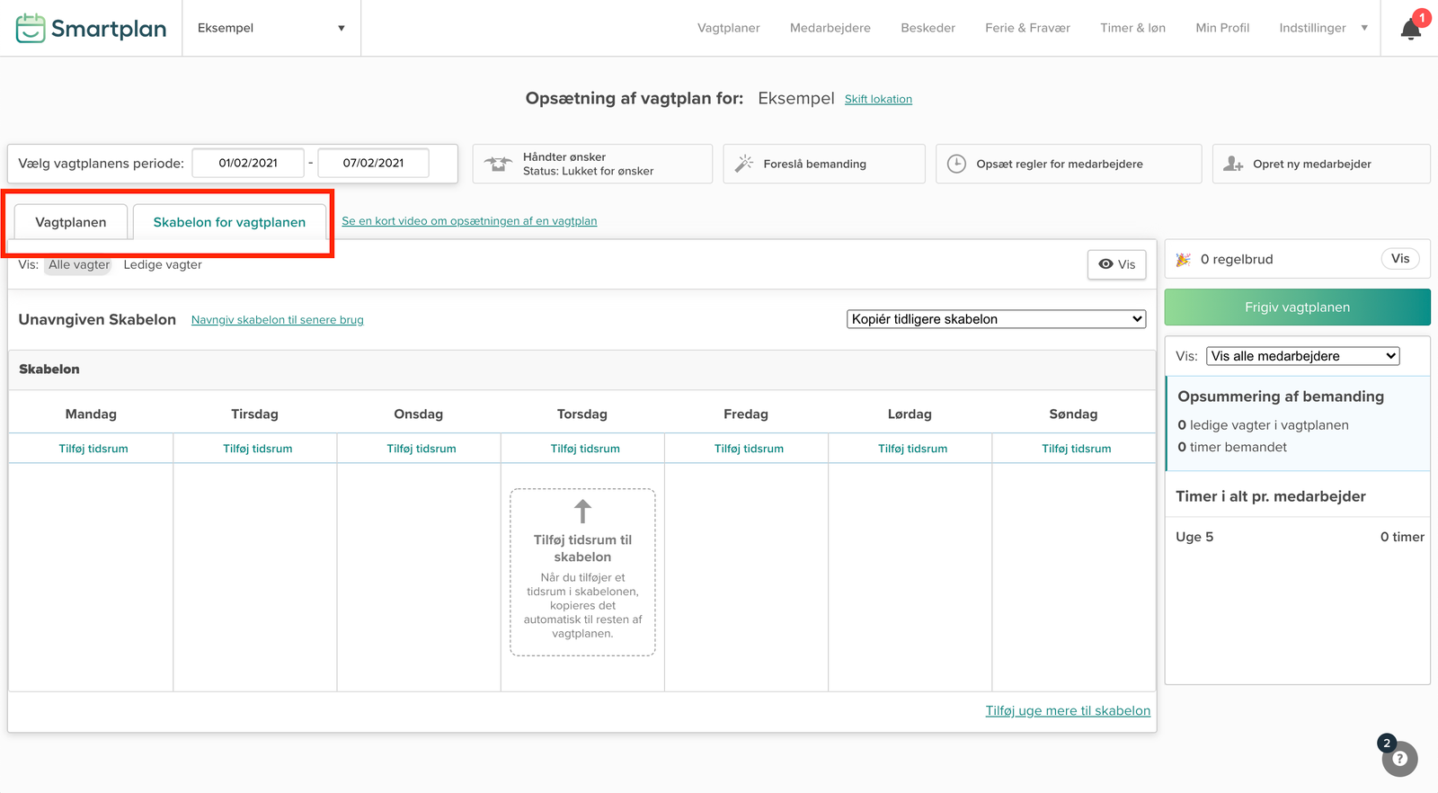 For at lave en skabelon imens du laver en vagtplan, skal du arbejde i fanen “Skabelon for vagtplanen”.