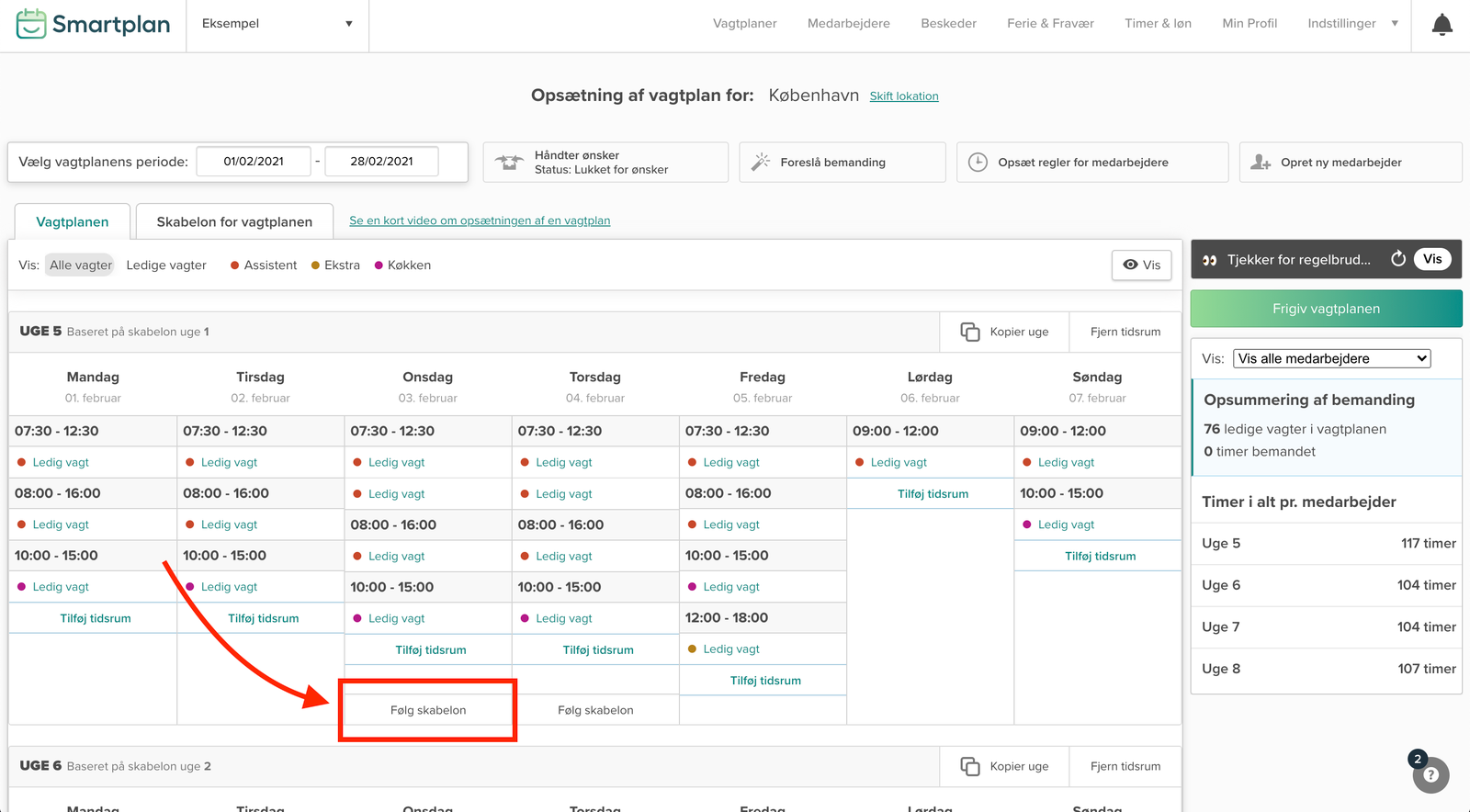Få vagtplanen til at følge skabelonen