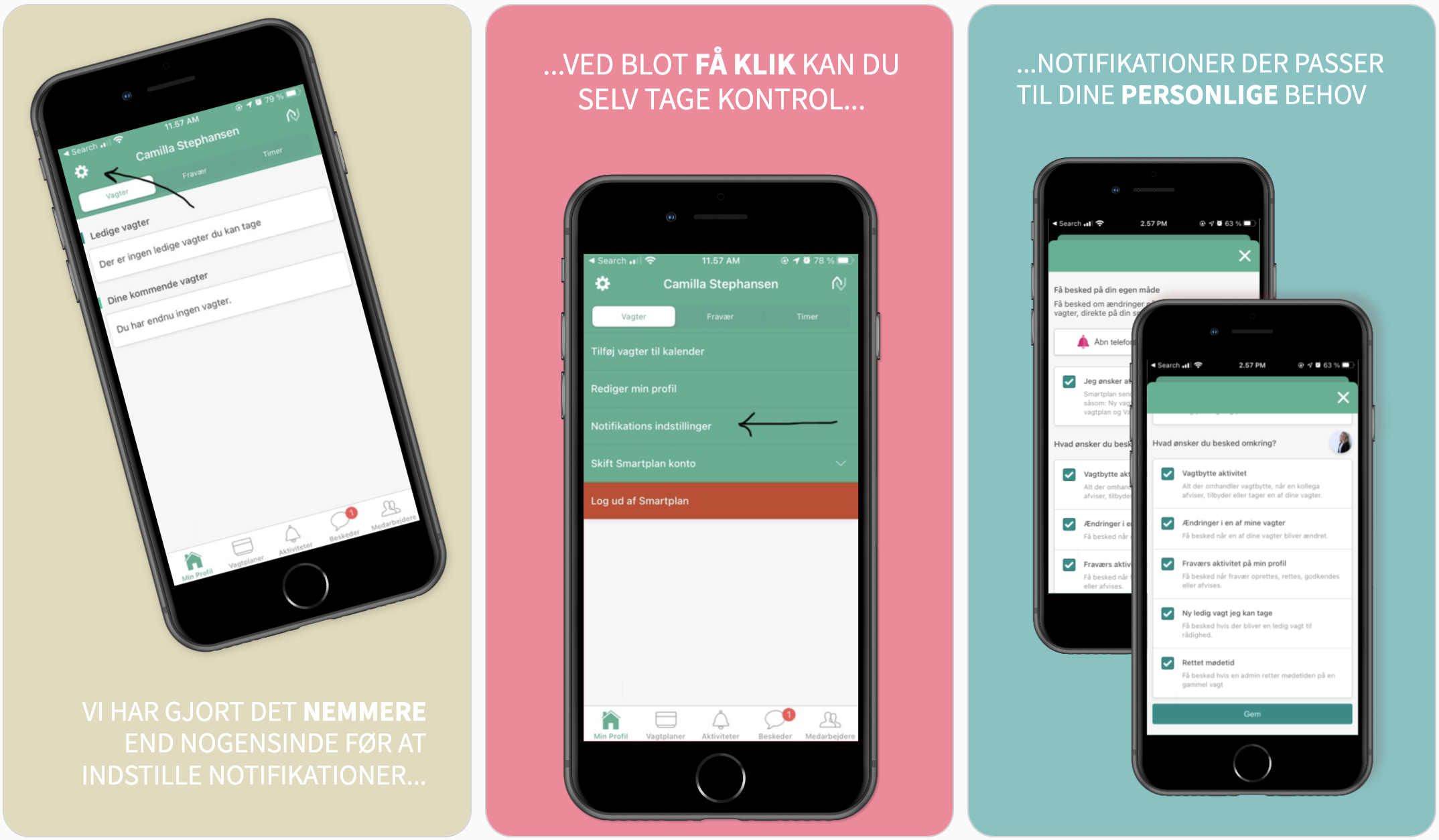 Vi har alle forskellige behov. Nogle gerne vil modtage push-beskeder om ALT hvad der foregår på ens vagtplan i Smartplan. Så er der nogle andre, som kun vil modtage enkelte, specifikke push-beskeder, og så er der nogle, der slet ikke har lyst til at modtage notifikationer på deres telefon, men derimod gerne vil modtage en email. Det er nu nemt for dig at indstille disse notifikationer, så de passer til netop dine præferencer.