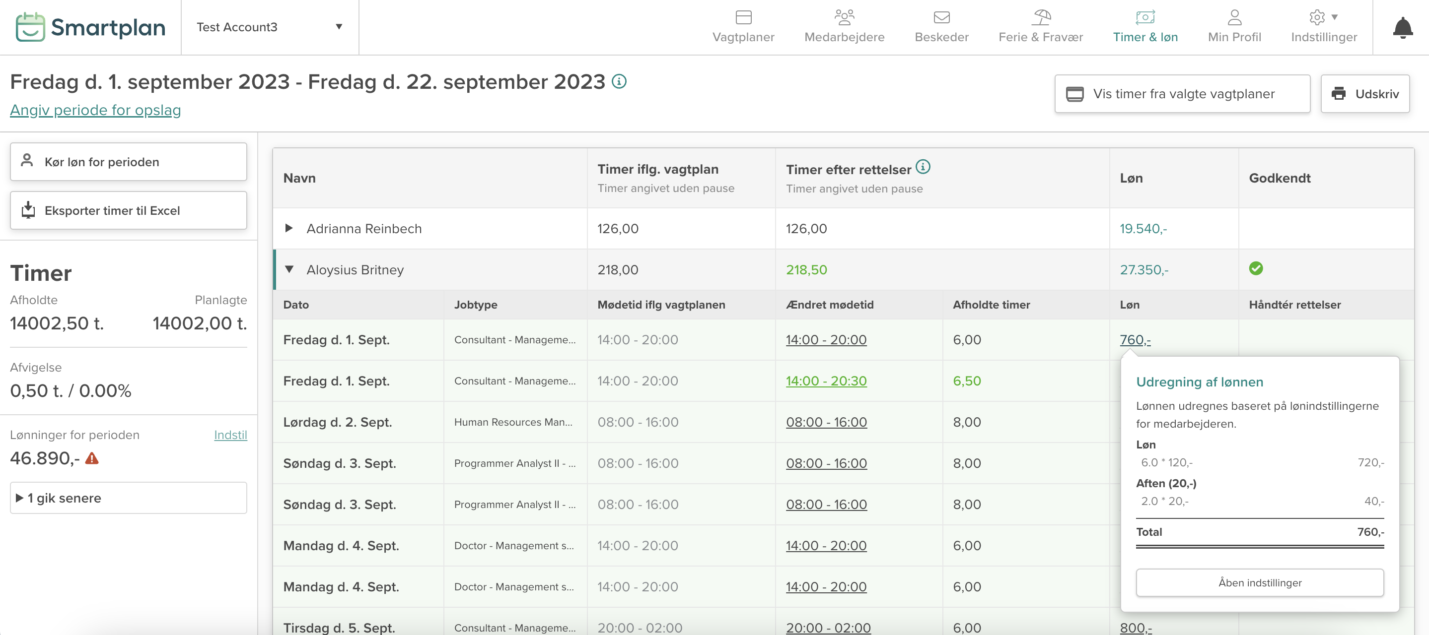 Lønudregningerne vises på hver vagt inde i Timer & løn. Når du har klikket på en medarbejder i timeoversigten, holder du blot musen henover deres løn. Udregningerne er detaljerede og indeholder alt den information, du kunne have brug for: