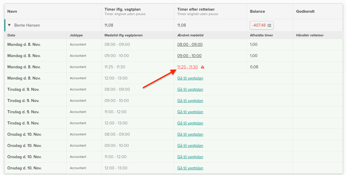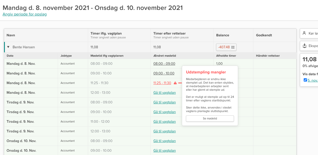 Hvis du kan se, at en medarbejder ikke får stemplet ud fra sin vagt, kan du nemt rette mødetiden, så det stemmer overens med den tid, som vedkommende faktisk har arbejdet.