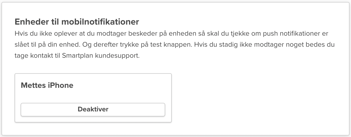 For at modtage mobilnotifikationer skal du sikre dig, at pushnotifikationer er slået til på din telefon, og at enheden står som aktiveret inde i Smartplan. Hvis du skulle opleve ikke at modtage en notifikation, selvom alting er slået rigtigt til, så kontakt endelig vores supportteam, så vi kan undersøge det nærmere for dig.