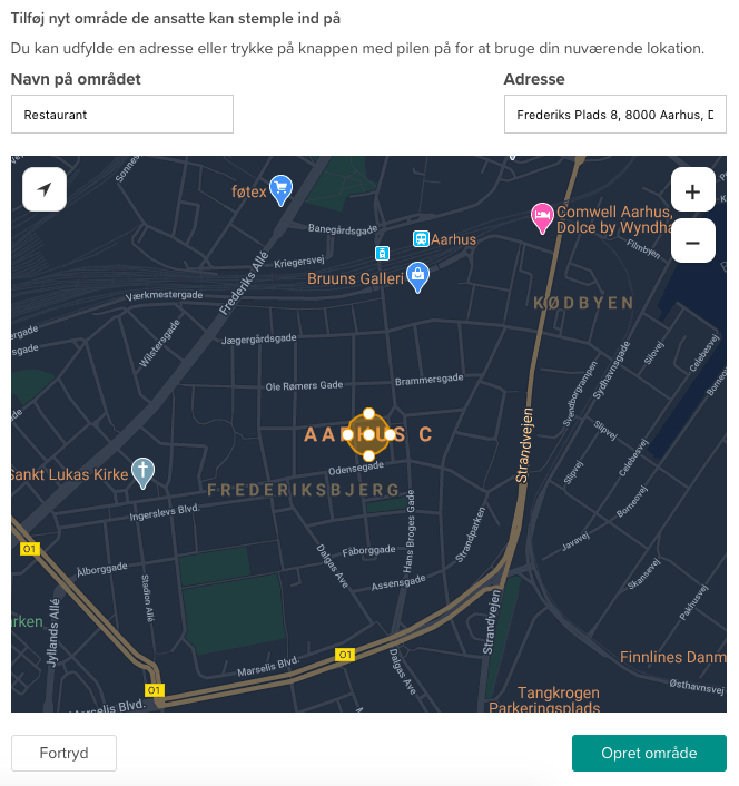 Helt praktisk så fungerer det ved, at administratorer kan definere geografiske områder på kontoen, hvor medarbejderne kan stemple ind og ud fra. I bestemmer helt selv, hvor mange områder I gerne vil have, og hvor store de skal være. For eksempel kan det både være et lille område omkring jeres arbejdsplads eller et stort område for hele Danmark. Eller I kan tilføje mange forskellige adresser, hvis jeres medarbejdere skal ud til forskellige kunder.