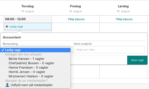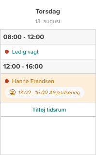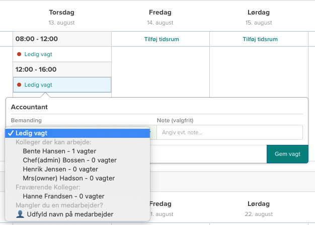 Så snart fraværet er godkendt, bliver det synligt i planlægningsværktøjet. Her forsøger jeg at give Hanne en vagt om eftermiddagen, hvor hun har fri: