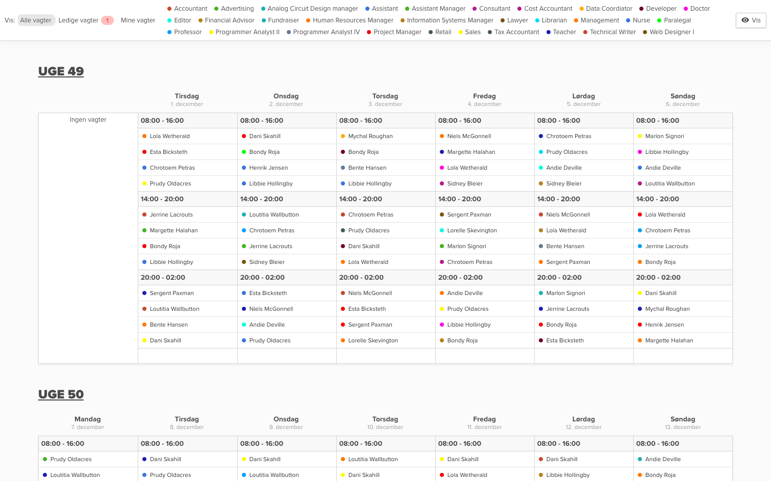 Efterhånden som du så scroller ned på vagtplanen for at få vist nogle af de andre uger, så vil du hele tiden kunne se de øverste to rækker med jobtyper i toppen af skærmen. Men der vil også være en pil, hvor du kan vælge at folde alle jobtyperne ud, så du igen har mulighed for at få fremhævet lige præcis den jobtype, du ønsker.