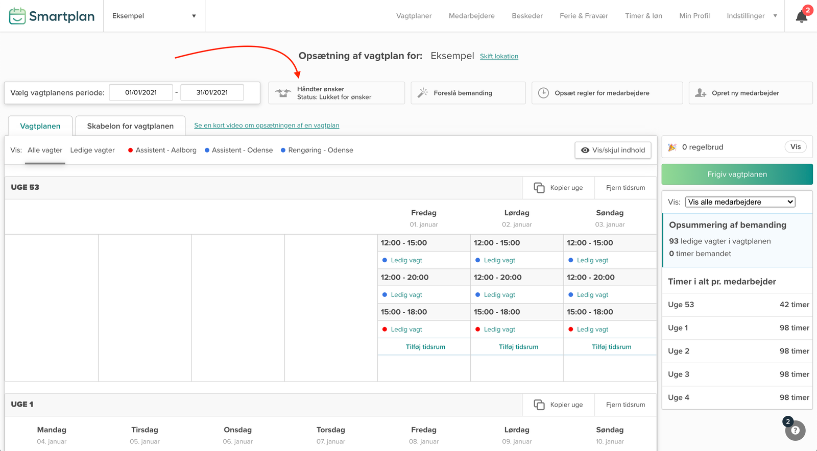 Når du har oprettet din vagtplan, kan du gøre vagtplanen åben for ønsker. Vagtplanen skal gøres åben for ønsker, imens den er under opsætning: