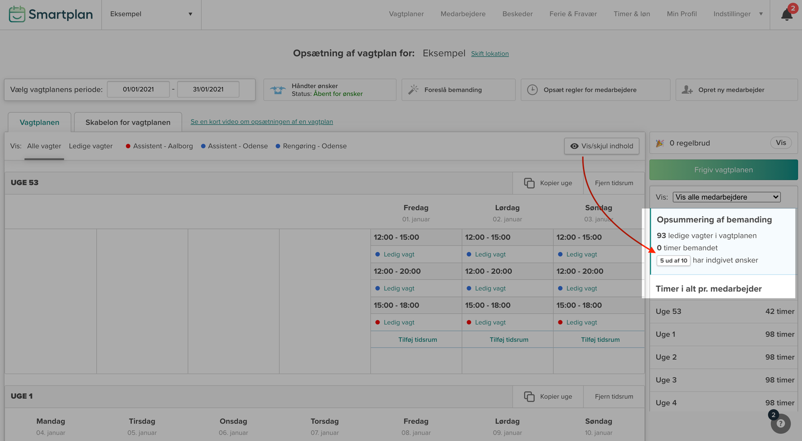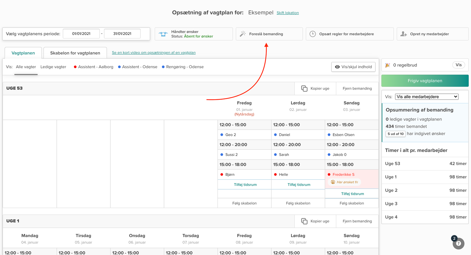 Du kan også benytte dig af funktionen “Foreslå bemanding”, når dine medarbejdere har indgivet ønsker (dette er en del af Smartplan Plus):